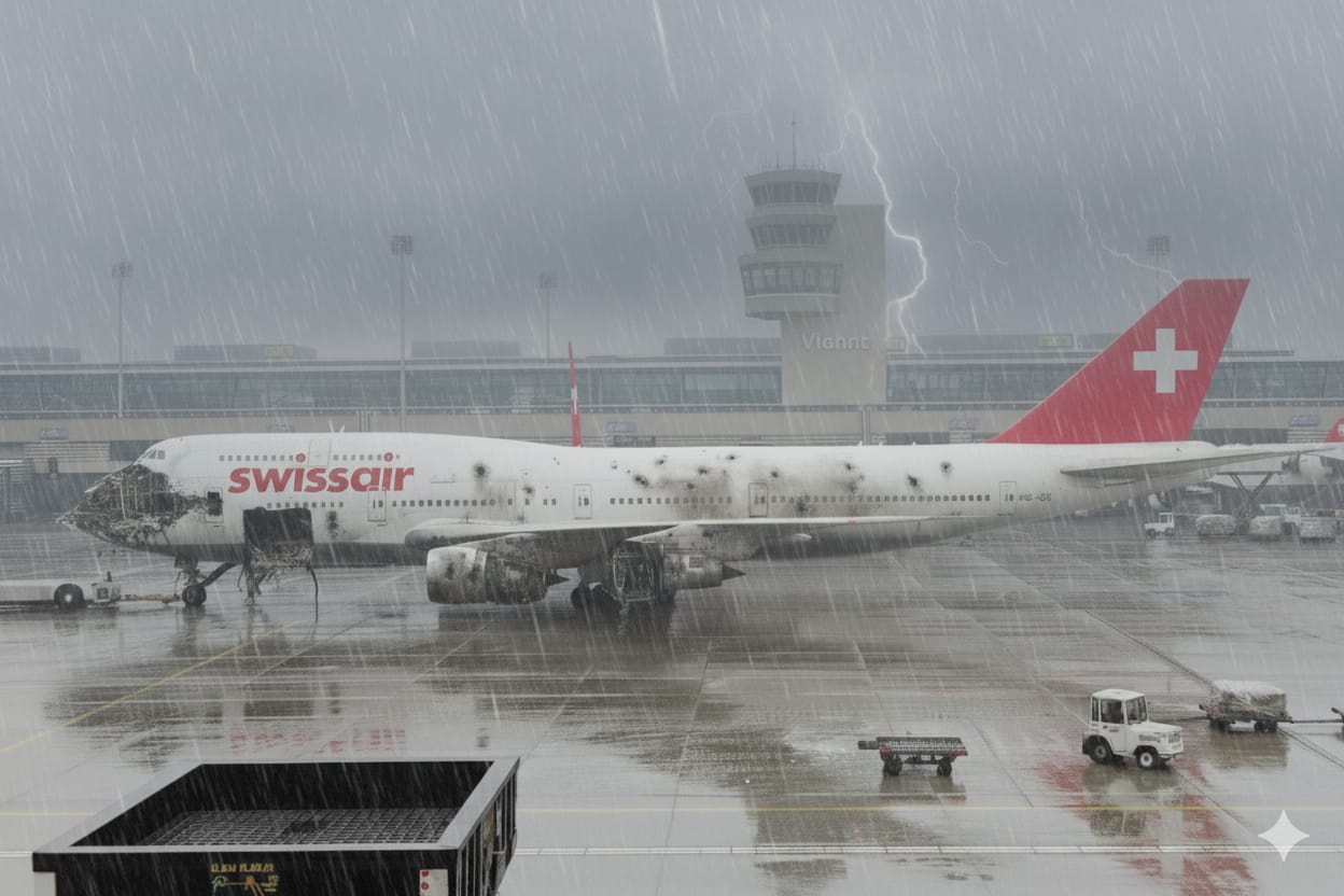 Und dann flogen wir nach Hause. ✈️ Auch dazu habe ich ein Bild generiert, das unseren Flieger wie eine Maschine durch ein Kriegsgebiet zeigt – ein schräger, aber lustiger Abschluss. Wir haben dann aber doch nicht einfach den nächsten genommen 😉 und sind super tapfer eingestiegen – und heil zu Hause angekommen.
