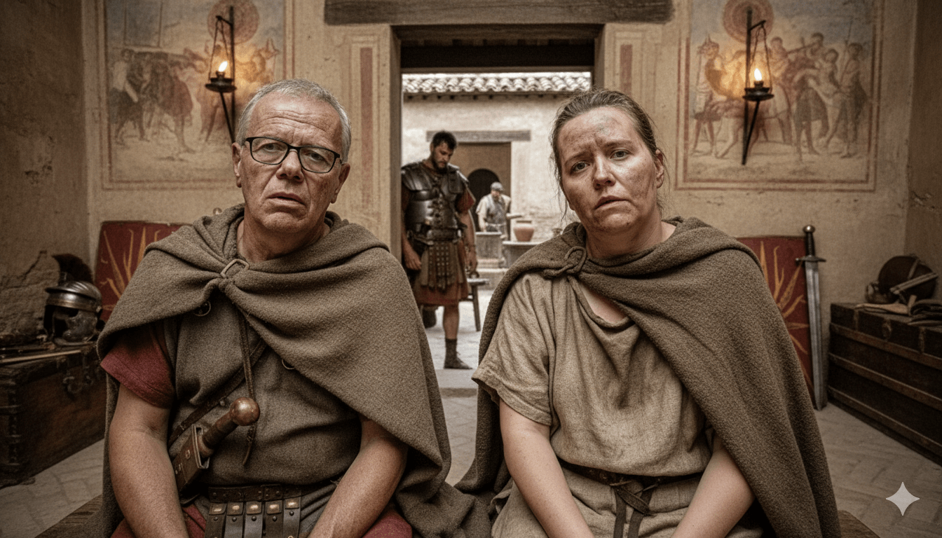 Und zu guter Letzt – weil wir wirklich müde waren – habe ich mit NanoBanana noch ein KI-Bild von uns gemacht: zwei erschöpfte Römer-Krieger nach drei Tagen AI-Schlacht. Passender hätte es kaum sein können.